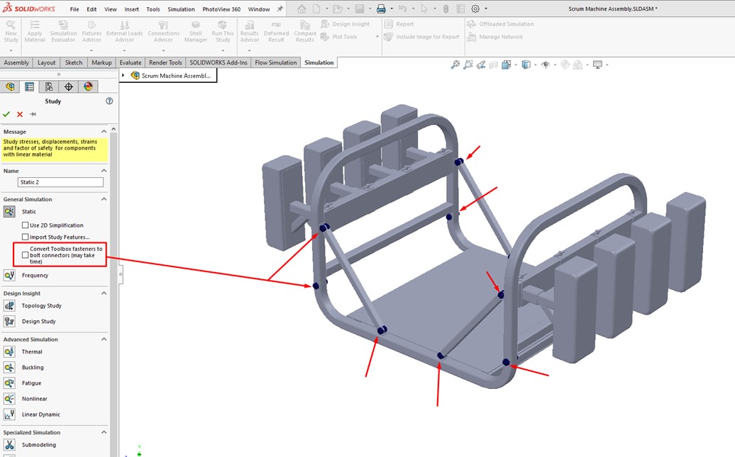 The first great feature we can utilize to save some time is the option to convert toolbox parts to bolt connectors this allows us to enter torque values, strength data and our required factor of safety. We can also test a range of materials or different types of connector if required. Another benefit of these connectors is the run time will be reduced and we don’t need to set up any extra contact sets.