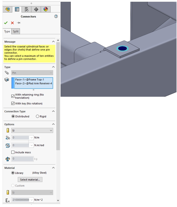 We will also replace these custom pins with a pin connector from the simulation library. This is again to aid run times but also so we can review the forces passing through any one of these pins to ensure they are safe.