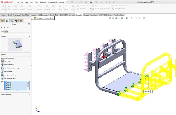Now the local interactions have been set up the next step is too fix the model in place. In this case we decided because the model is symmetrical and we are assuming symmetrical forces to be applied we can use the SOLIDWORKS symmetry fixtures. This helps to stabilise the model and majorly increases run time by cutting the mesh in half!