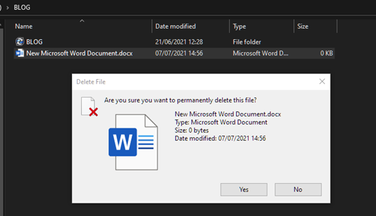 Did you know that if you hold shift when you hit delete that the behaviour is different and the file is fully deleted straight away? That is why you don’t get a warning with a ‘standard’ Delete, but you do with Shift+Delete. This is known as 'destroying' rather than deleting.