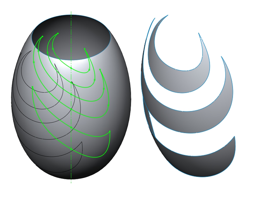 Next we sketched the outline of the logo pieces in a 2D sketch and used the wrap feature to take transfer their outlines onto the complex surface.