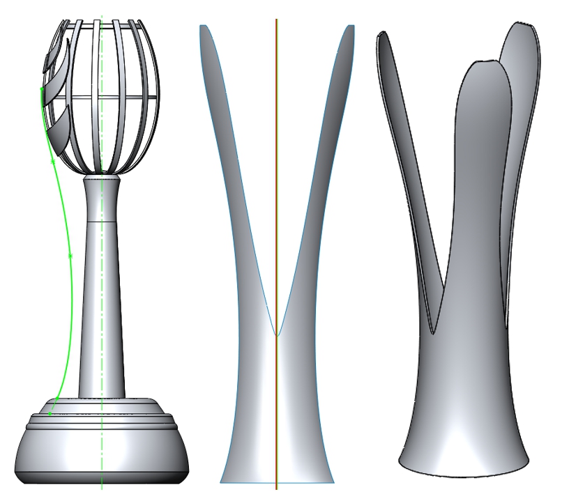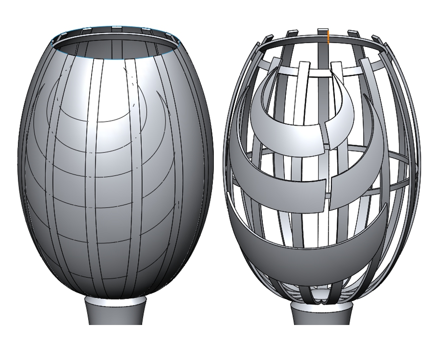 To form the cup, we used a sweep feature with a rectangular profile to create one of the strands and then a circular pattern to complete it.