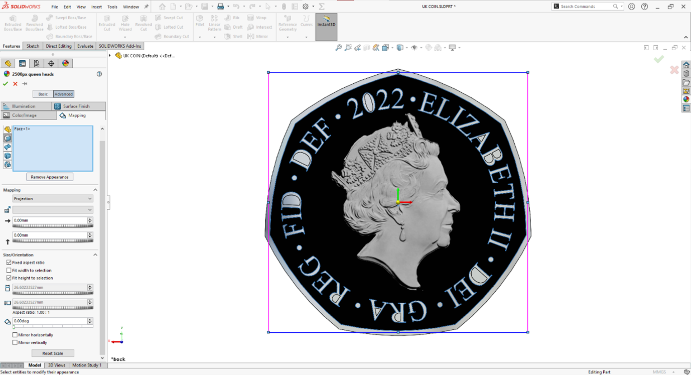 This weekend is the Queen’s Platinum Jubilee and to celebrate the momentous occasion a new commemorative 50p has entered circulation. With only 1.3 million minted so far, these 50ps are currently some of the rarest around so we thought a virtual one built in SOLIDWORKS and rendered with SOLIDWORKS Visualize would be almost as good.