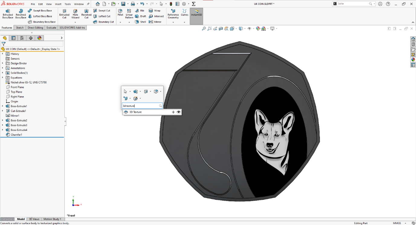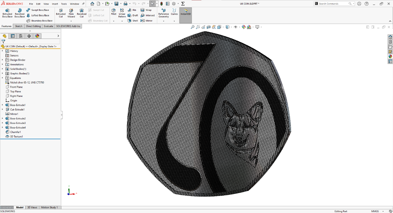 The shape of the coin, the equilateral curve heptagon along with the text and the large 70 can be fairly easily created using sketch pictures of the coin to aid in getting the sketches set up followed by simple extrudes and extrude cuts. The real challenge was the Queen’s classic portrait and of course our plan of the Corgi’s portrait as well.