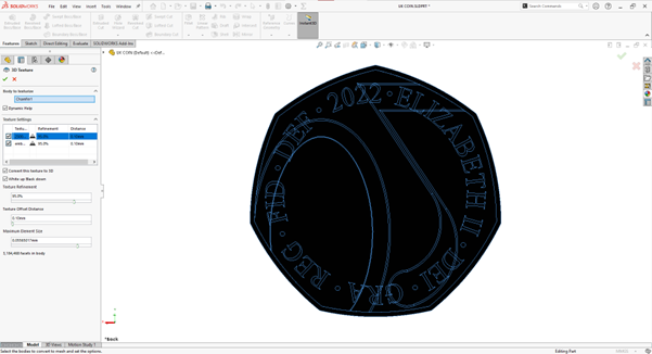 The classic use case for this tool are things like dimples, knurls or bumps on a shoe tread so why not the Queen’s portrait or a Corgi on a 50p coin. In 2022 to help us further the feature was enhanced to increase performance and responsiveness when creating these highly detailed and complex textures.