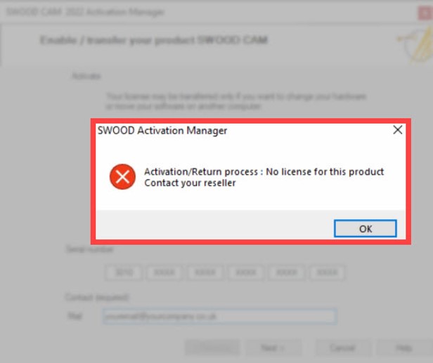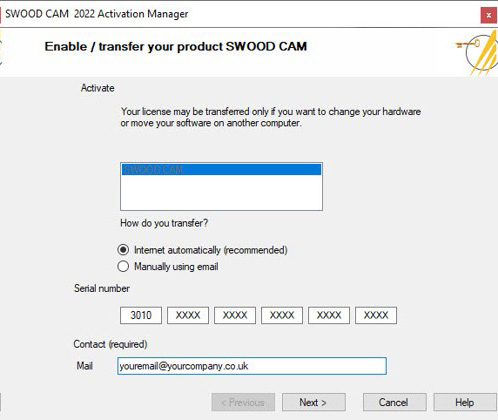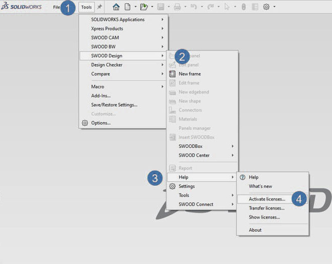 Tools > SWOOD CAM/Design > Help > Activate Licences.