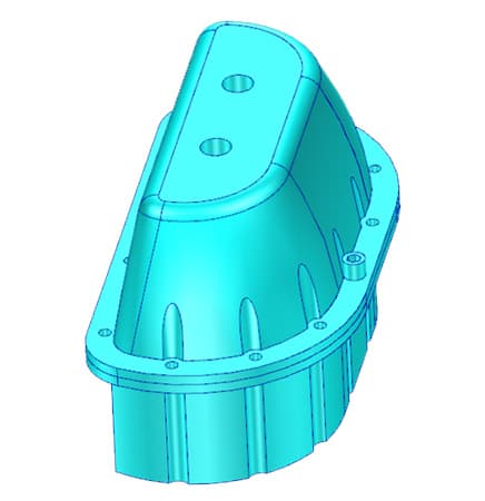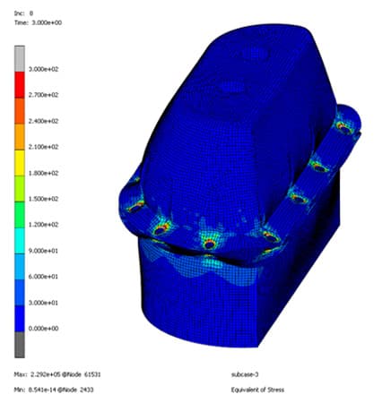 In this example we have a housing that is bolted to another component at a number of locations and is subject to a large external load. We can build a global shell model using beams to represent the bolts and contact between the two components.