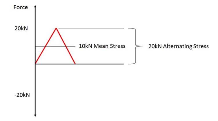 The stress study was set up with 20 kN static load. This implied that, when fully reversed, the alternating stress amplitude was actually 40 kN as shown by this diagram.
