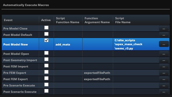 Another example, created for a client in the space industry, is a script that builds a standard set of model check runs when a Nastran deck is exported. It uses an IF check on the file name so that any deck written out with the string RUNCHECK included in the name triggers the script.