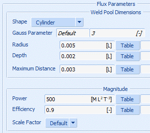 The weld pool is defined by the dimensions of the pool as a cylinder, ellipsoid or cone along with the total power of the weld flux. As the pool passes along the path the heat is passed to those elements which fall within it resulting in their temperature increase.
