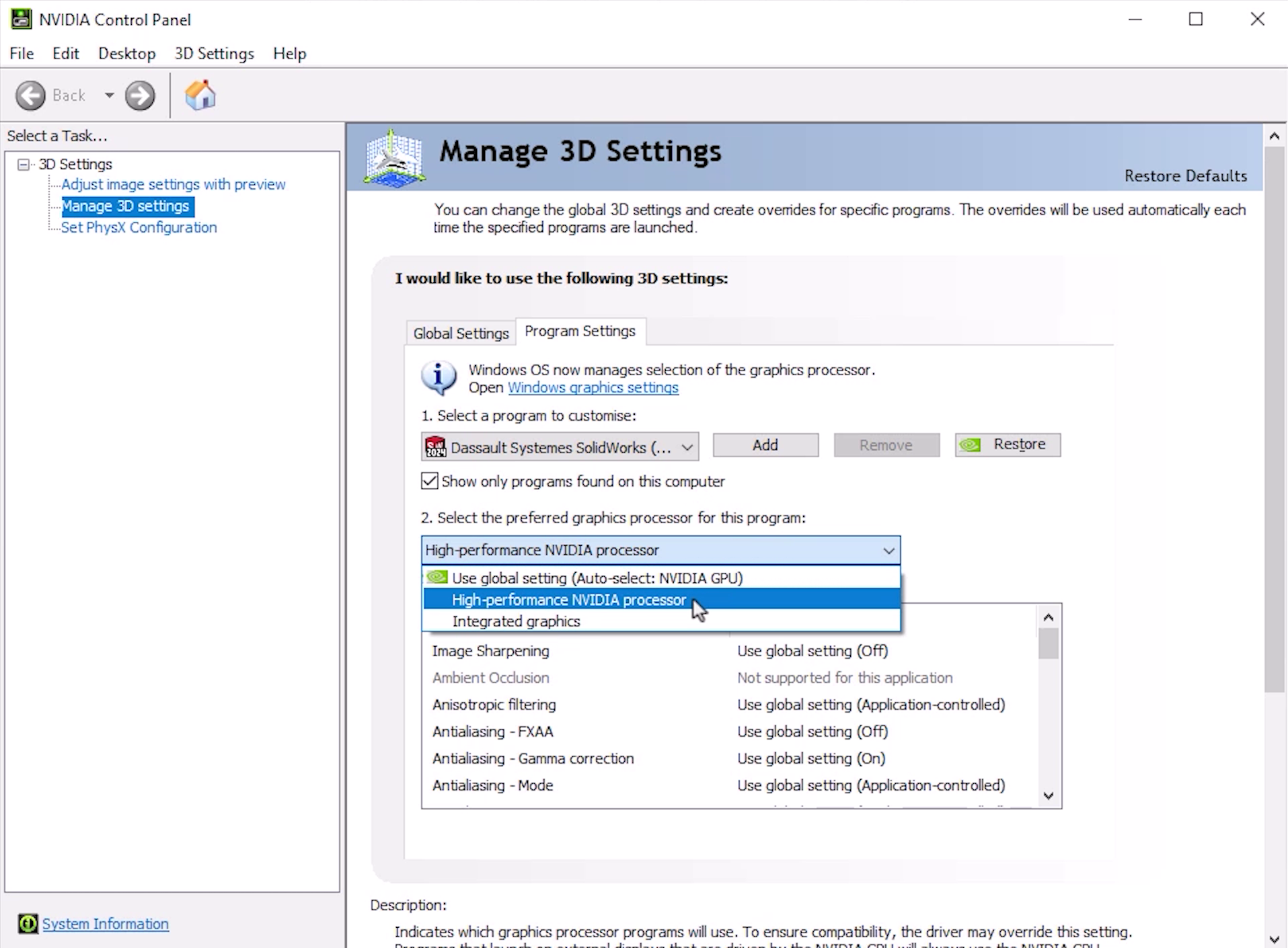 For laptop users, confirming that SOLIDWORKS is utilising the dedicated GPU is crucial for optimal performance.