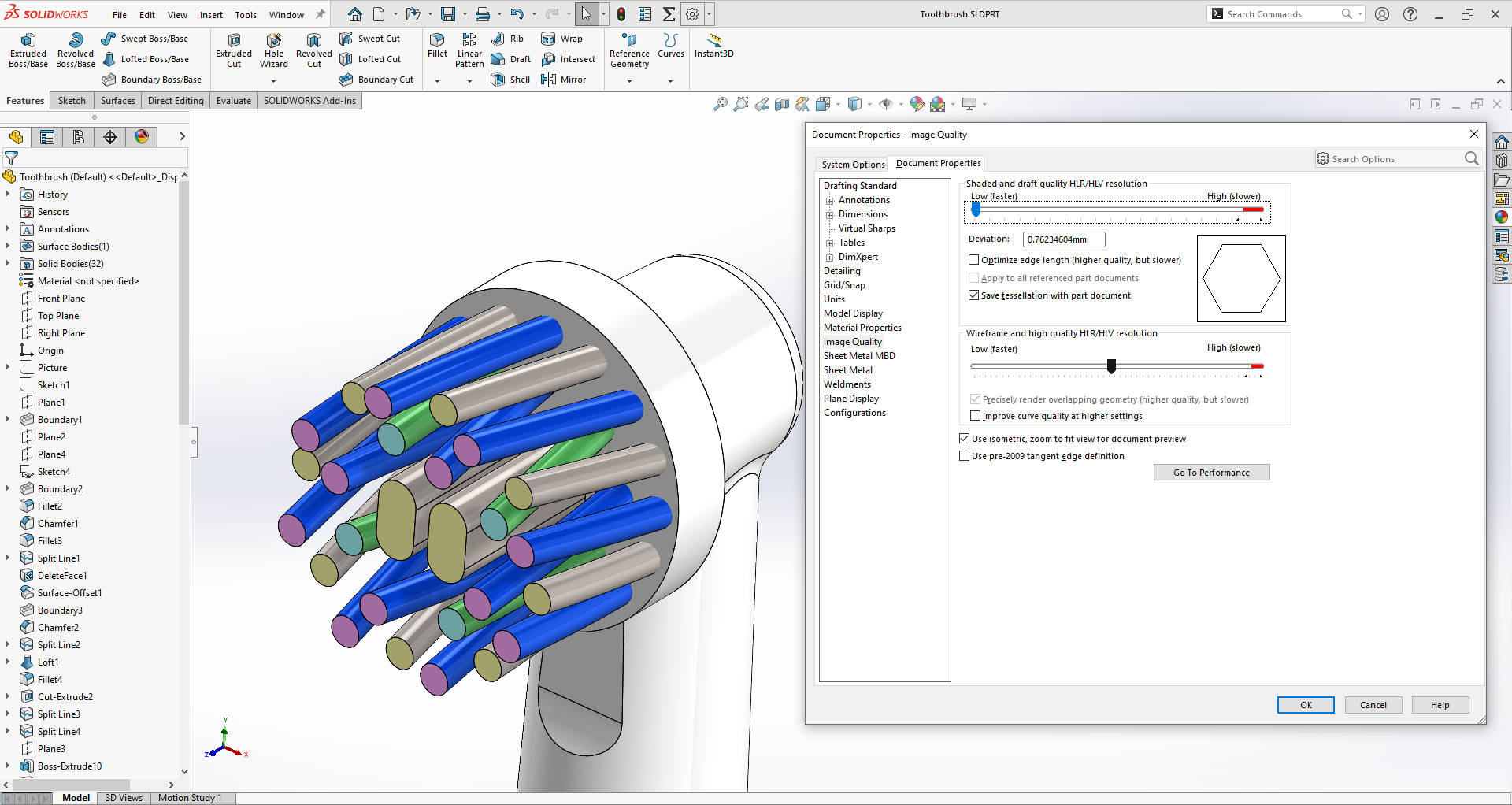The document properties in SOLIDWORKS contain image quality sliders, and if you are seeing degraded performance, then it’s worth checking in on these to find a balance between performance and visual fidelity.