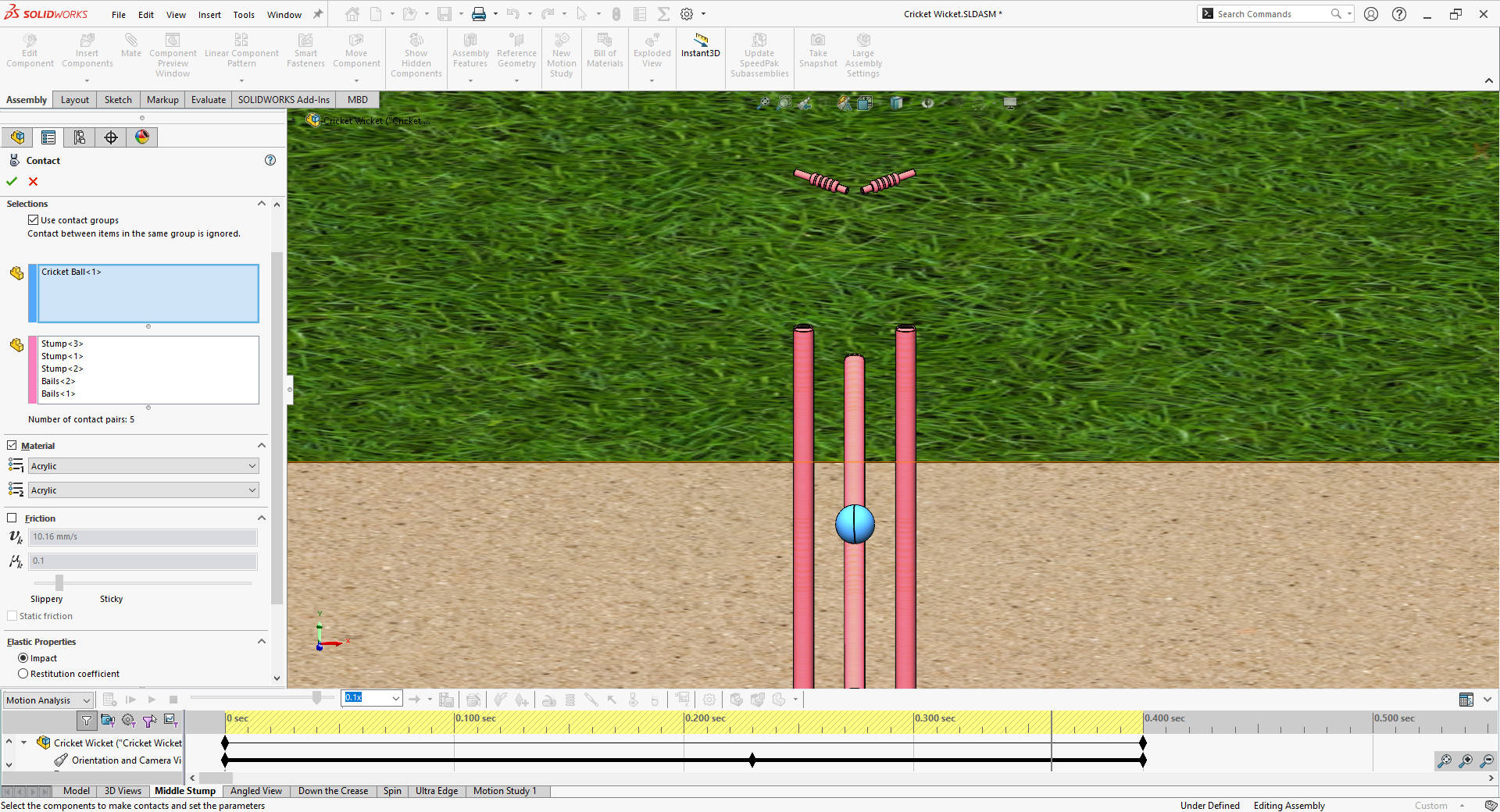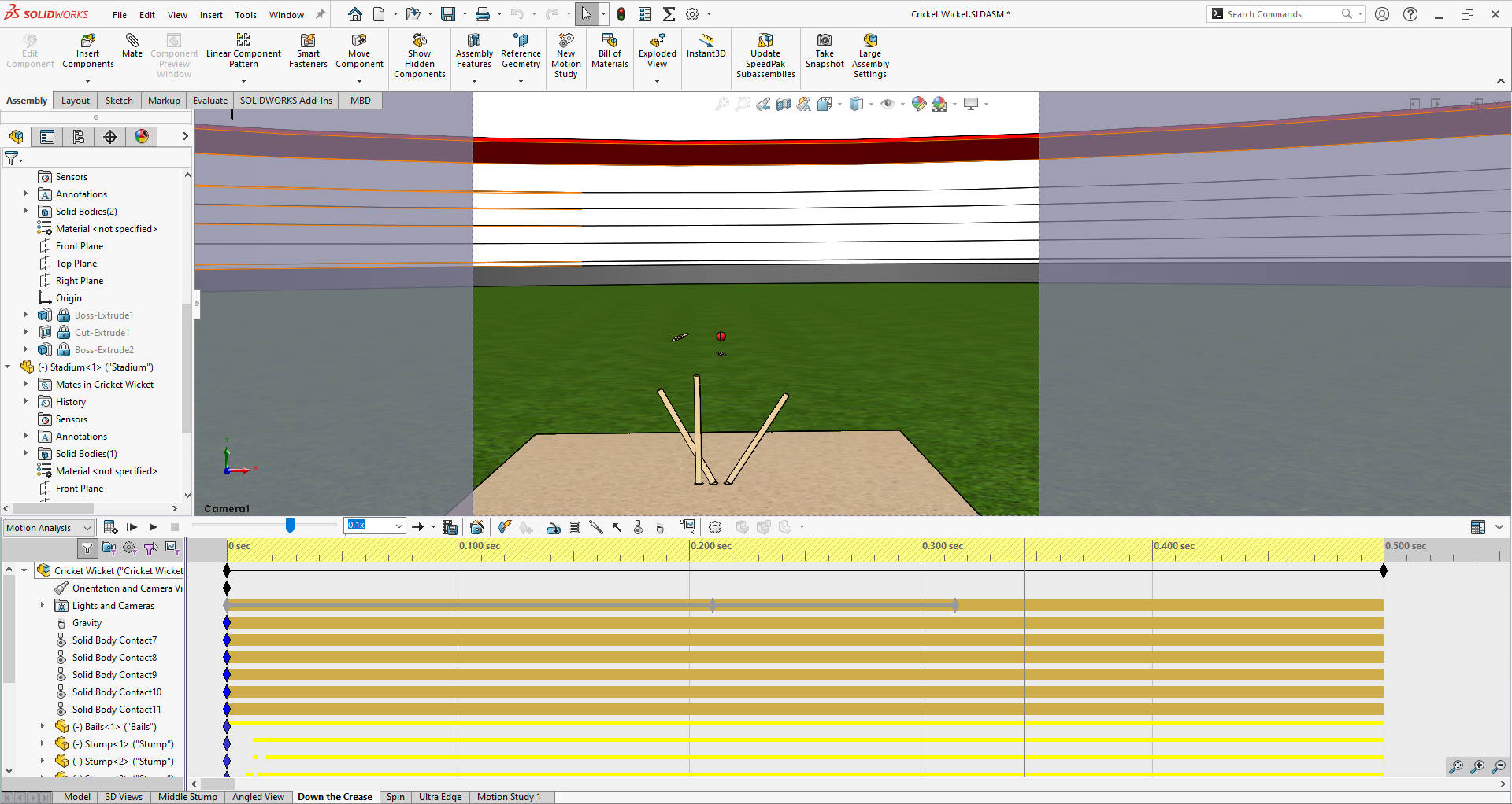 We’ve parametrically modelled up the geometry of the ball, stumps, and bails in SOLIDWORKS to specification, and put them into an assembly to virtually represent a cricket pitch.