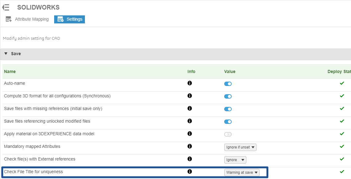 The option effectively acts as a check for duplicate names. This will block users from saving to 3DEXPERIENCE if the file has a Title matching that of another item already in the platform.