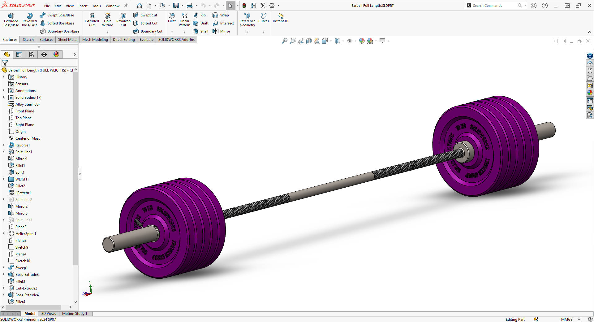 Barbells are a great model for beginner and intermediate SOLIDWORKS users to practise with.