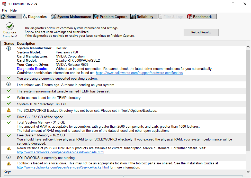 You can find out what your system is currently running using the SOLIDWORKS Rx tool. This diagnostics tool is installed alongside SOLIDWORKS and can be found within the Windows Start menu.