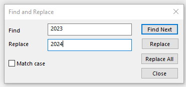 Using the Find/Replace function, we can change the old year (2024) to the current year (2025). Select ‘Replace All’ and all system paths will modify to reference the most up-to-date files.