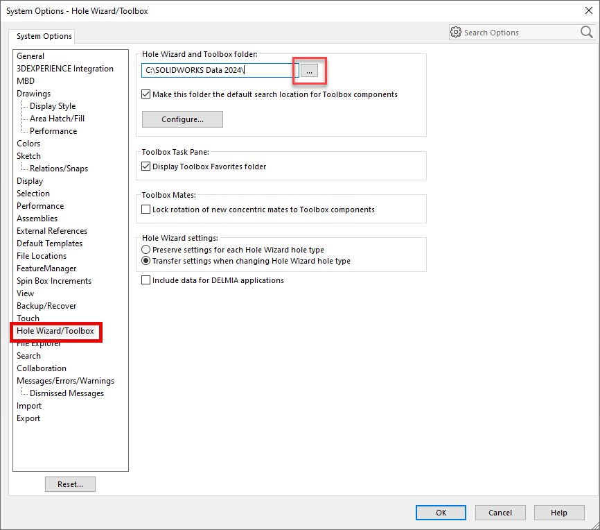 Find ‘Hole Wizard/Toolbox’ in the System Options, and ensure the file path you see under ‘Hole Wizard and Toolbox folder’ is as expected. If not, use the […] to modify this path.