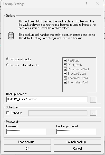 - Create a folder in which to save the backup files – it is recommended this is located in the same folder as your PDM archives and databases, e.g. C:\PDM_Admin\Backup.