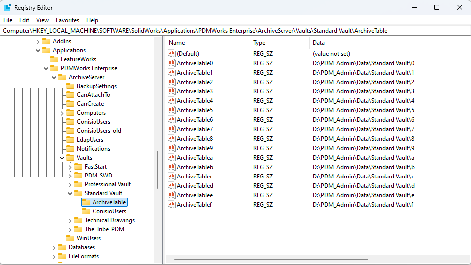 HKEY_LOCAL_MACHINE\SOFTWARE\SOLIDWORKS\Applications\PDMWorks Enterprise\ArchiveServer\Vaults\[vaultname]\ArchiveTable
