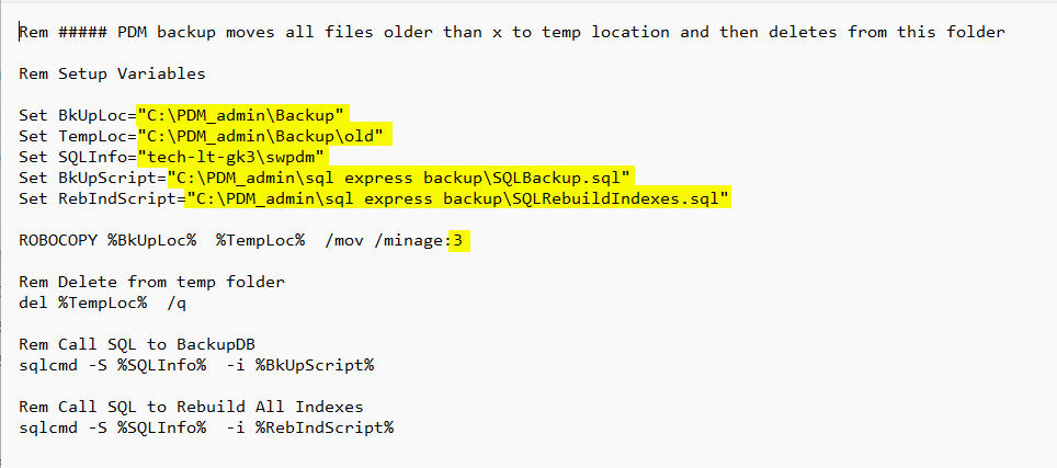 - ROBOCOPY %BkUpLoc% %TempLoc% /mov /minage:3 – Setting for how old backup files have to be before being deleted. E.g. “3” would delete backups older than 3 days.