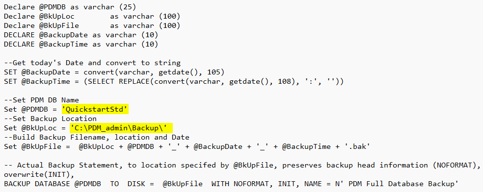 - Set @BkUpLoc = Location for the database backup file to be saved in (The same location set in the batch script).