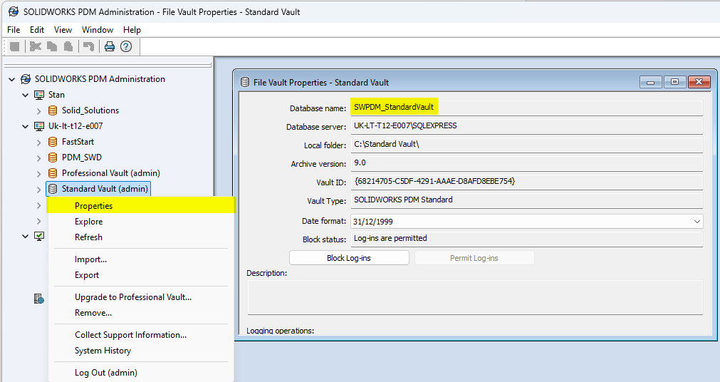 - Set @PDMDB = Database name of your PDM STD vault. The database name can be found in the vault properties in the PDM Administration Tool. Right-click on the vault name and select ‘Properties’.