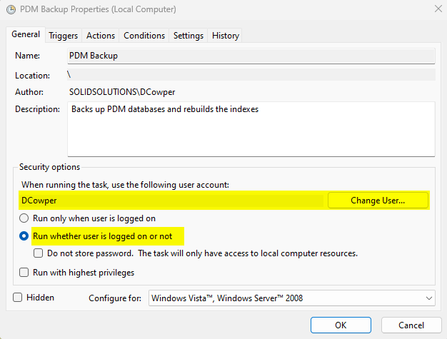 With the script set to run as above, automatic backups should be taken daily and you will have the files required to recover your PDM database in the event of a failure, be that hardware or from a malware attack.