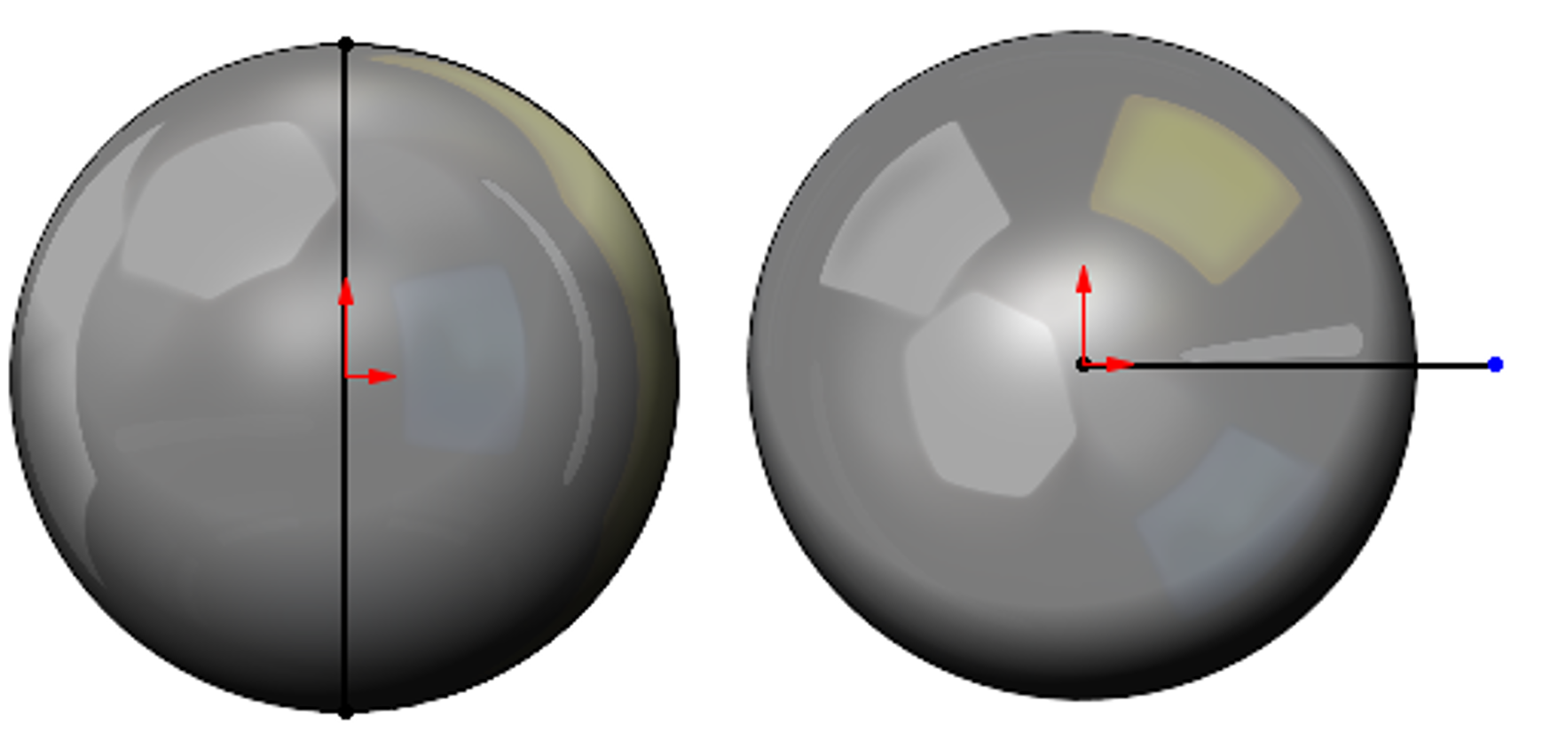 - Create two separate sketches, one on the front plane, which is a line that goes completely top to bottom of our new offset surface, and another on the top plane, a single line from the centre and is larger than the radius of the sphere.