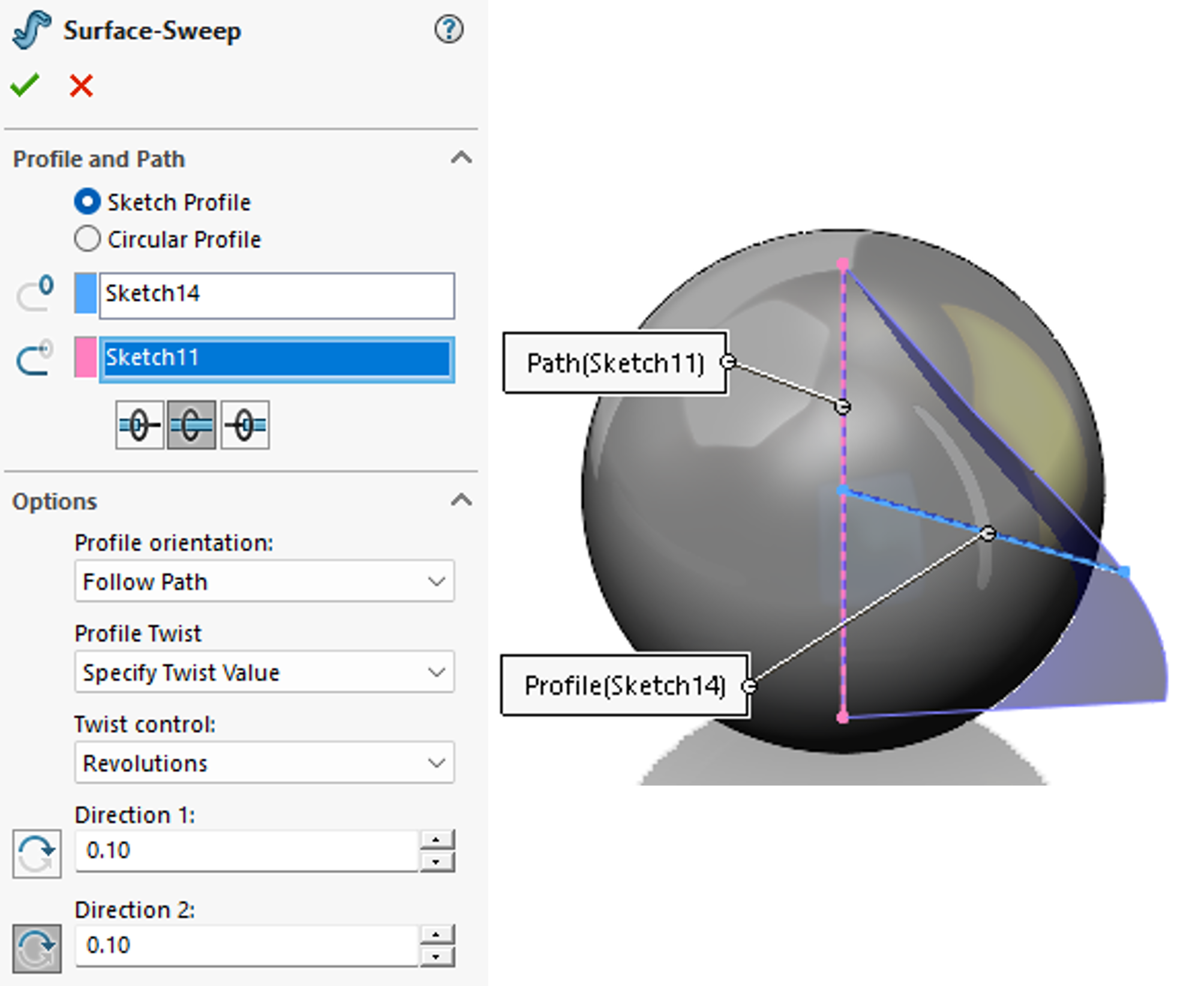 - Now create a swept surface from these two sketches, the first sketch is our path, the second is our profile. You will need to select the bidirectional option since the profile starts from the centre and under profile twist, select “Specify Twist Value.” You will see a preview of our next reference surface, which is effectively our groove path, we want to keep things simple with 30 degrees in both directions for now, but later you could have fun playing with these controls to make even more interesting shapes.