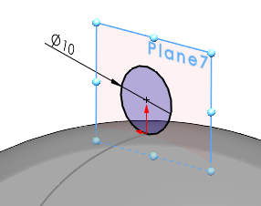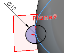- Create a new sketch on this plane and draw a circle that is coincident to the path and tangent to the outside of the sphere, here we add a 10mm diameter dimension.