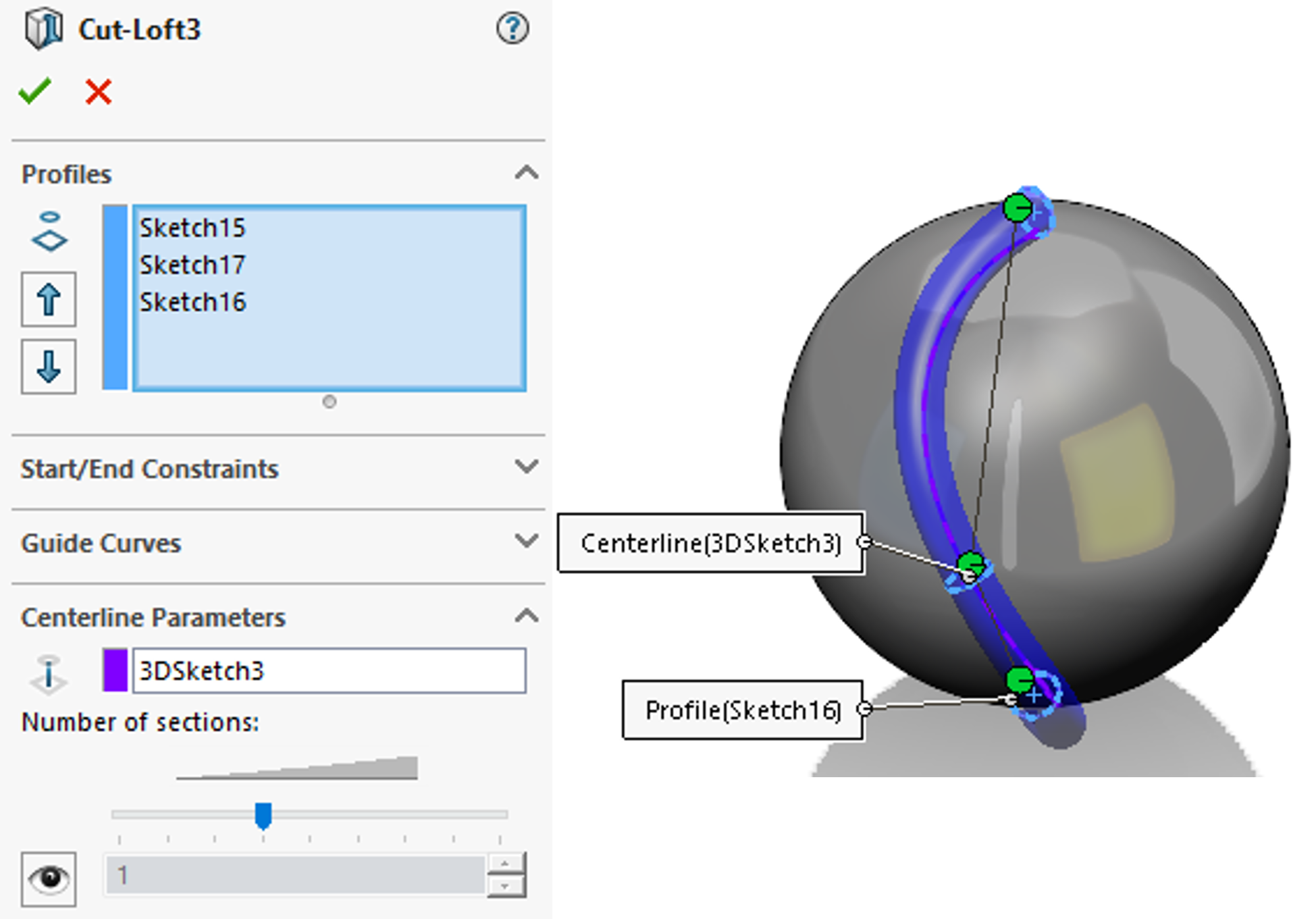 - To cut out the groove we will use the Lofted Cut tool, once activated you need to pick all three profiles in a logical order, either top to bottom or vice versa. We want our groove to follow the path we created so you need to select our 3D Sketch for the centreline path. If you are happy with the preview, finish the command to see our first groove.