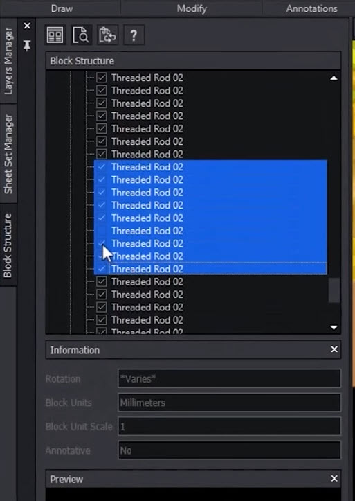 Managing nested blocks—blocks within blocks—has never been easier. DraftSight 2025 introduces the Block Structure Palette, a tool that allows users to organize, preview, hide, and isolate blocks with greater control.