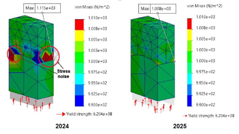 Additionally, the algorithm behind the scenes has been modified to improve the accuracy when bonding curved surfaces together using the surface-to-surface formulation between mesh containing elements of different sizes. This in turn eliminates stress noise at these interaction boundaries and gives a clearer result from the more accurate solution allowing users to quickly and correctly understand these kinds of results.