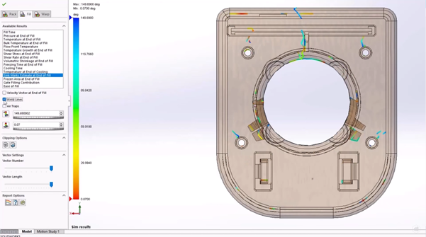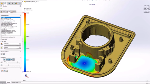 Fill analysis in SolidWorks Plastics Standard has also seen multiple enhancements, with better performance using fibre-filled materials (by 25%) and accelerated fill-time animations (up to 75% quicker in the larger cases) due to being able to use more available memory for the generation. Air traps can now be identified, even in the case of a short shot, and isosurface animations export smoother.
