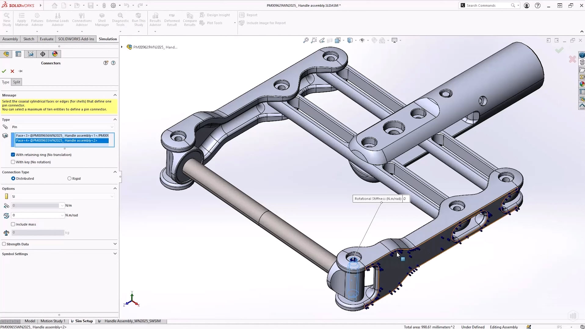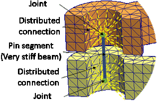 The distributed connection type has been available for pins in linear static studies since 2020, giving more accurate stresses around the connector due to the ability of the coupling nodes on the cylindrical faces to move relative to each other.