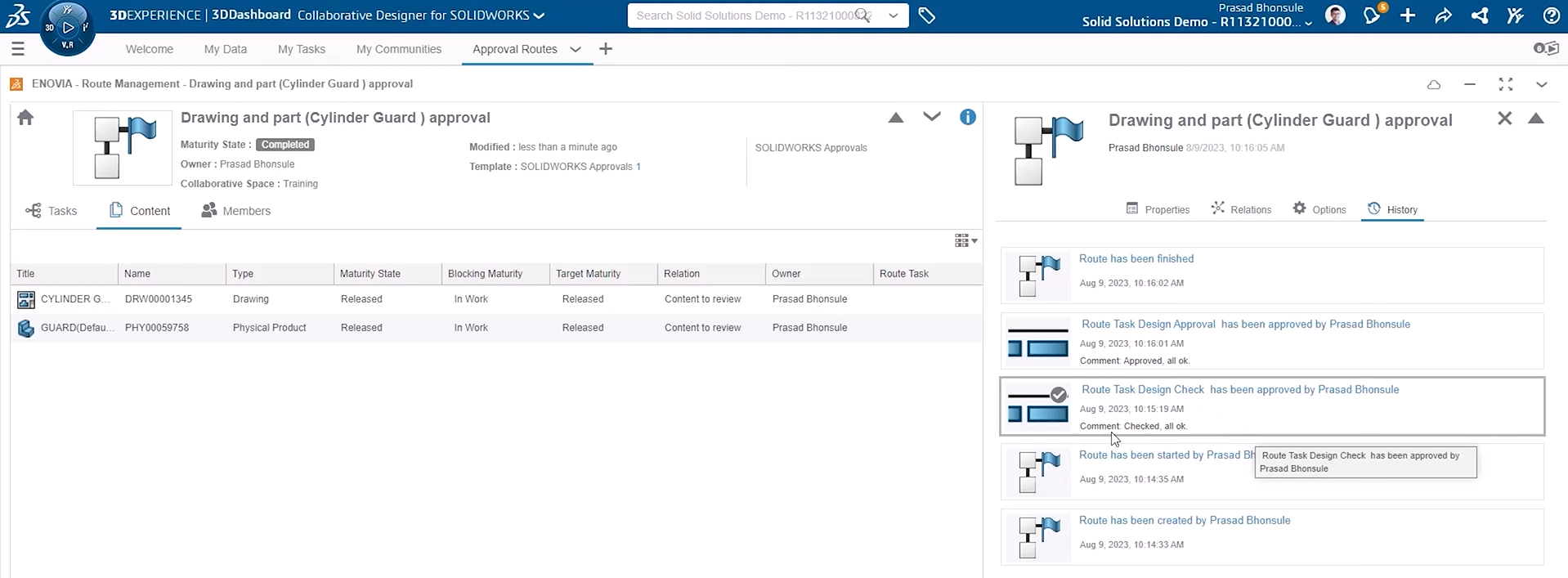 Under the approval routes tab, you can find completed routes and check that the state of any associated objects has been changed.