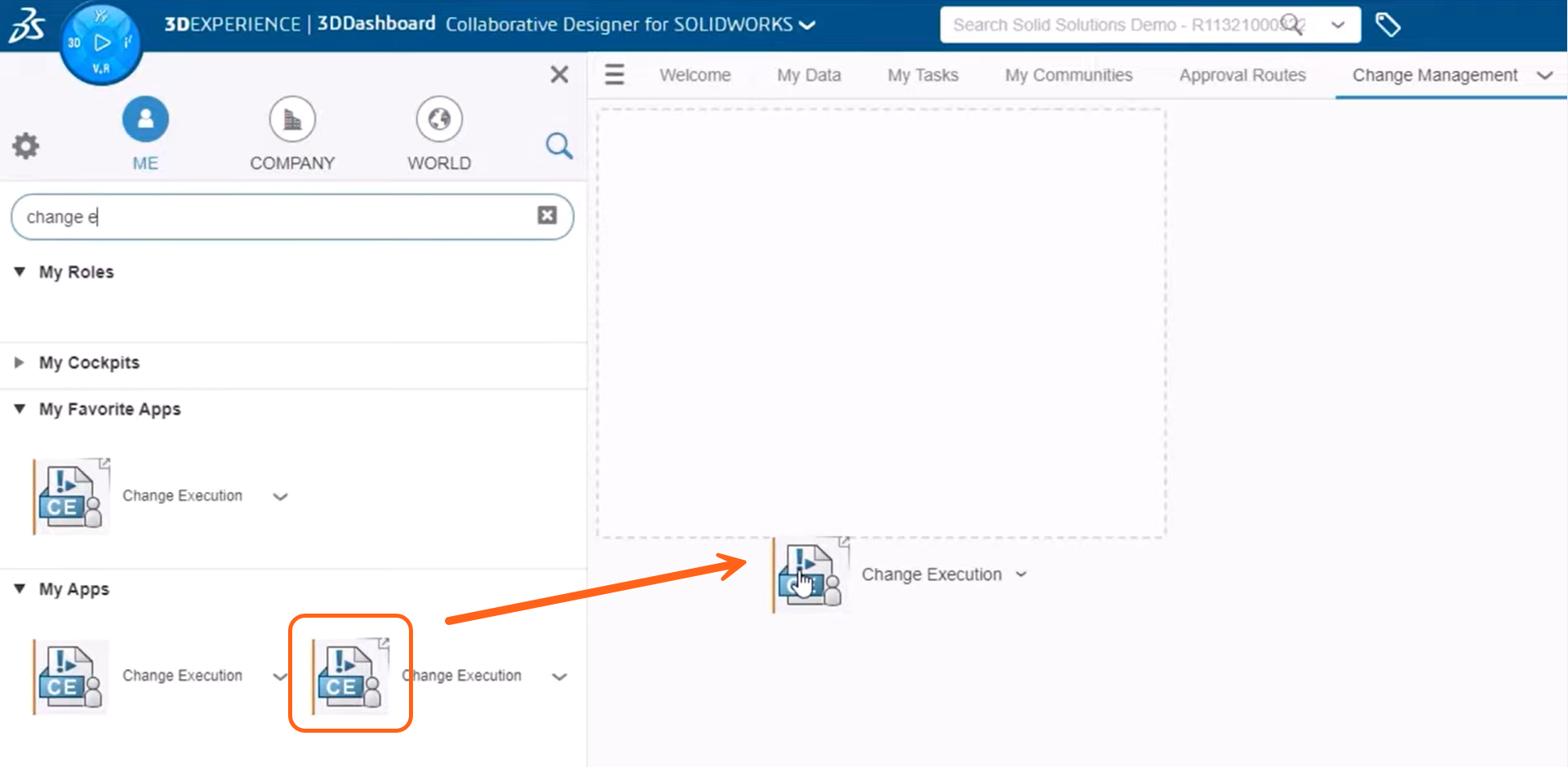 The Change Execution app is used to manage change actions. We can add a new tab to our dashboard and call it "Change Management". Search for the ‘Change Execution’ app with a small arrow in its icon to indicate that it can be added to a dashboard as a widget.