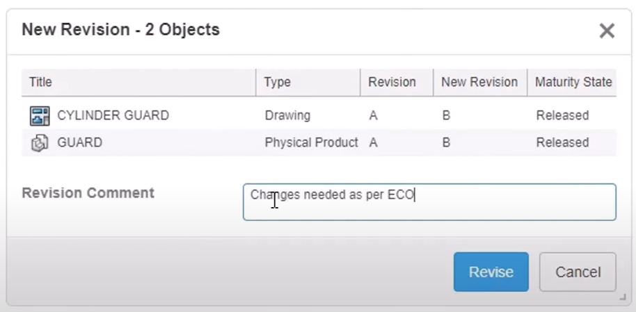 The revision dialog box will appear, showing us the current and new revisions of the files. We can then add a revision comment if needed before selecting ‘Revise’.