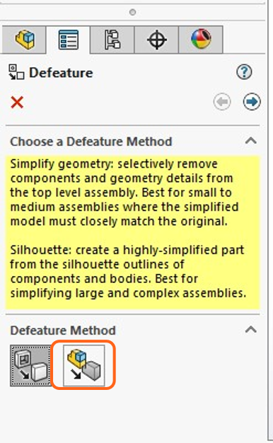 Define rules by which to simplify the model. This method will utilise the outer edges of the assembly (known as the silhouette) to provide a defeatured model that preserves the existing volume while removing internal details.