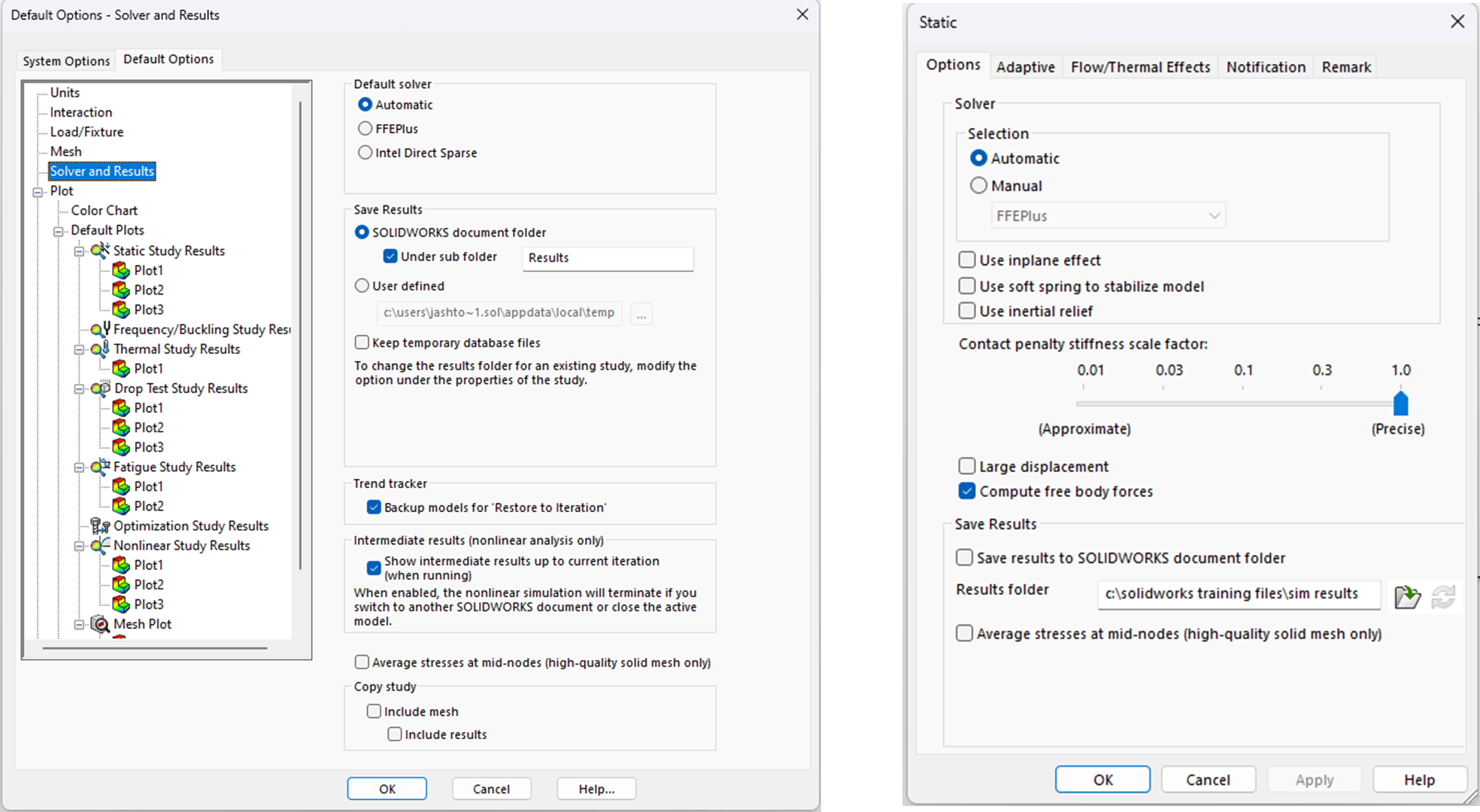 The default behaviour is for the results to be stored in the open document folder. This can be altered through the Simulation Default Options before creating a study, or from within the study properties.