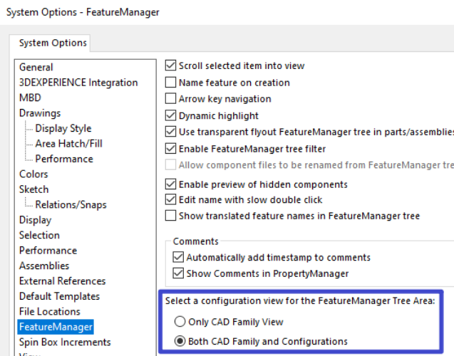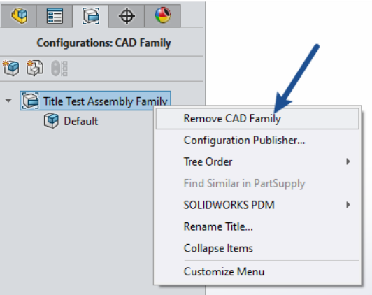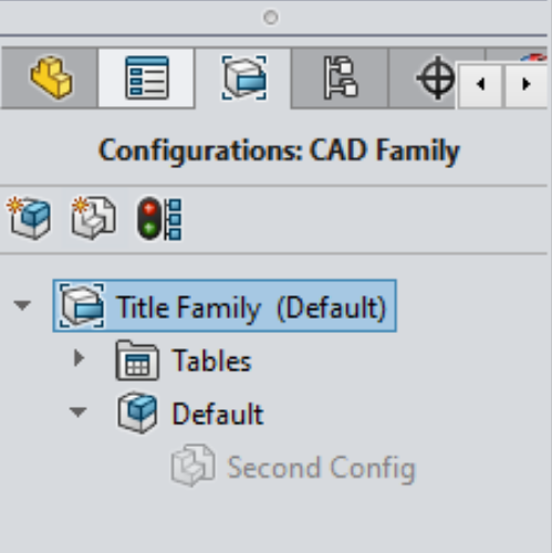 Firstly, there are changes to the FeatureManager Tree. The Configurations: CAD Family tab replaces the default 'Configurations' view.