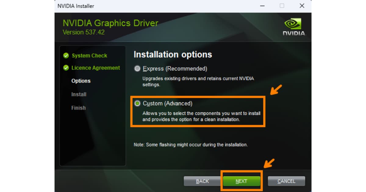 Tick 'Perform a clean installation', then click Next. Your monitors or laptop screen may flicker or go black briefly during this process - fear not, that is expected behaviour as the graphics card is effectively rebooting!