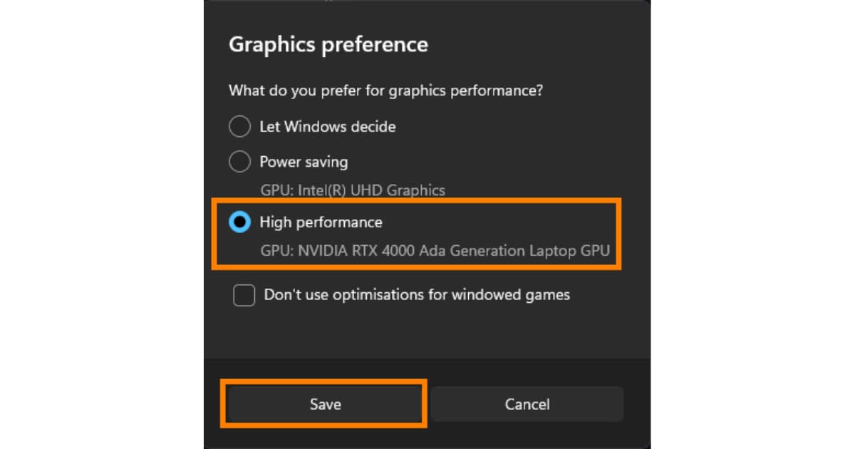 4. Choose High Performance (GPU: NVIDIA), then click Save. SOLIDWORKS will now default to using your NVIDIA card.