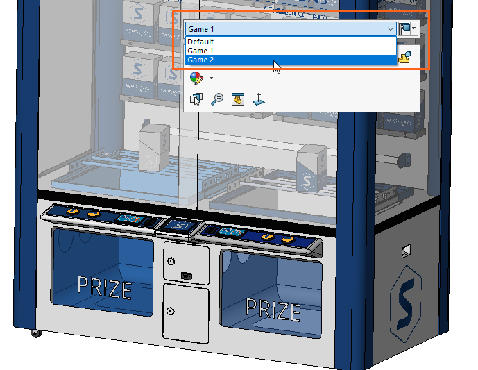 The default configuration is now showing the ‘Game 1’ subassembly configuration. The problem here is that the game subassembly sits within another subassembly layer. Currently there is only one ‘default’ configuration for this subassembly and as a result, all configurations of the top level will only ever show one version of the game configurations.