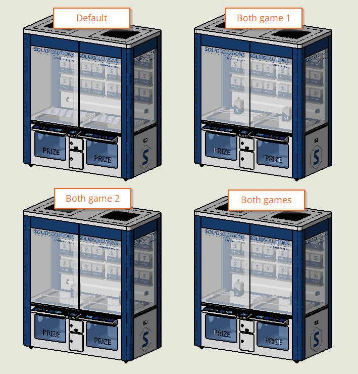 In this case, we have three separate subassembly configurations where the claw machine games will be laid out.