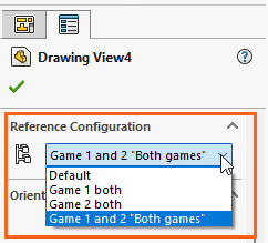 Existing drawing views of parts and assemblies with configurations can also be modified to show each configuration by selecting the drawing view and using the 'Reference Configuration' drop-down menu inside the property manager to change the configuration displayed.