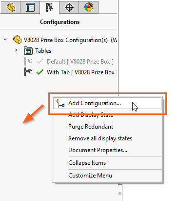 If you right click on a feature, sketch dimension, or part in an assembly you will see the ‘Configure [Item Name]’ option. This will open a configuration table for the selected parameters, allowing you to suppress or modify properties.