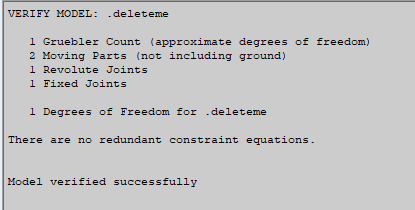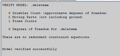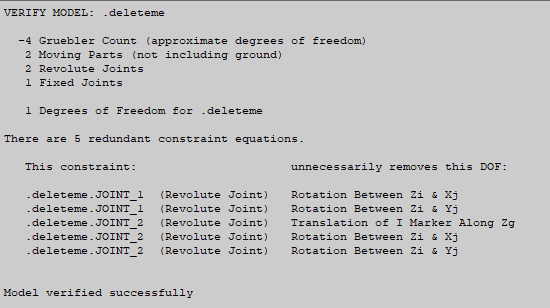 A lumped mass (in red) makes the forces unsymmetrical. Let’s run this model through the Model Verification app in Adams View to calculate the degrees of freedom.
