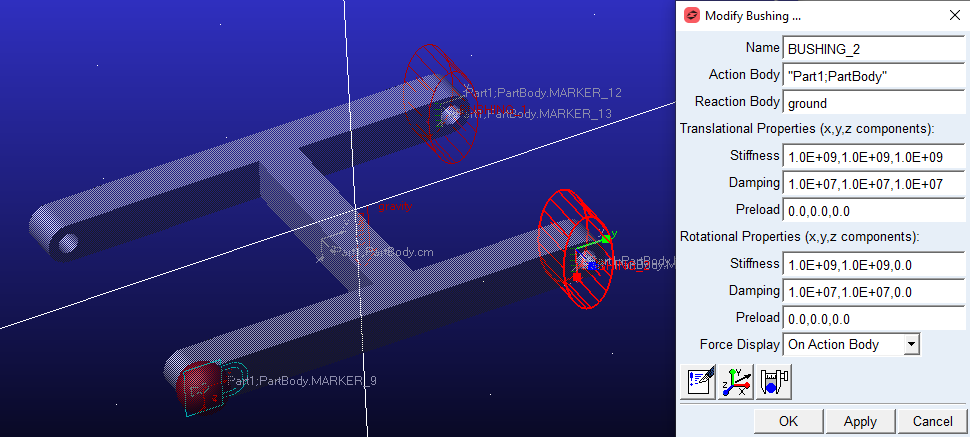 A bushing connection allows us to set the stiffness and damping for each of the six directions between locations on two separate components and/or the ground.